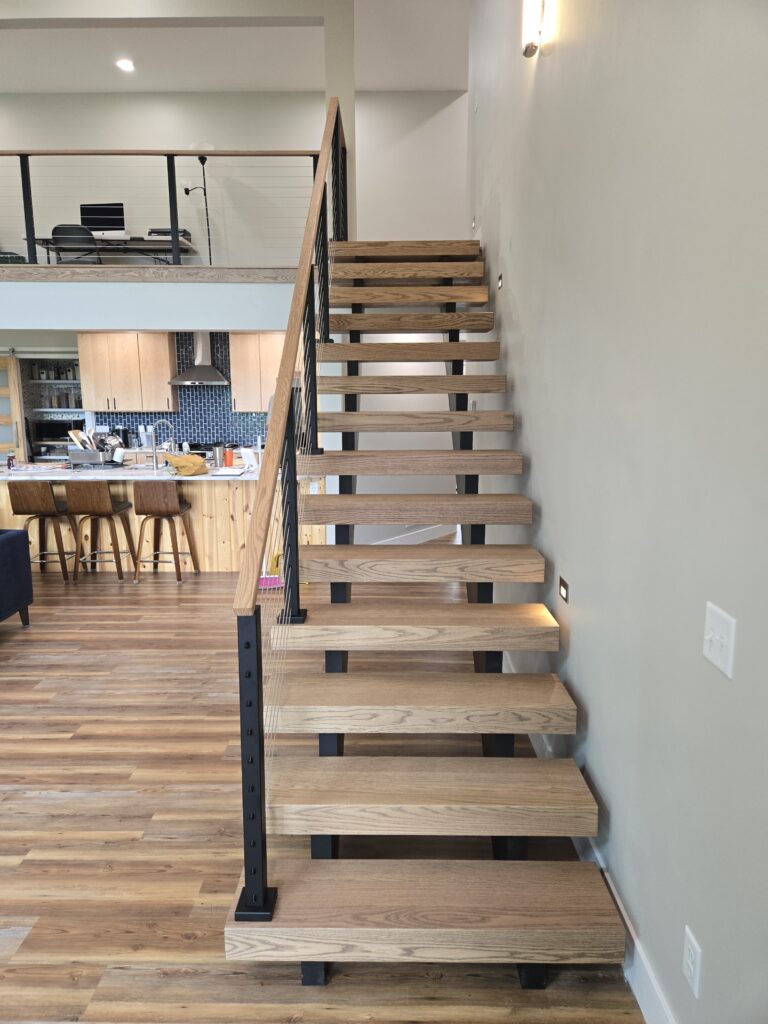 Rise is an entirely wooden system that utilizes a dual stinger design. The stringers are made of laminated red oak, and can be painted either white or black. The treads can be stained any color just like any of our other Viewrail stair systems, and this system pairs well with both rod and cable railing systems. The treads are fastened utilizing adhesives and dowel pins, so there are no exposed fasteners. The all wood construction and simple connections lend itself to a warm and inviting look that is still minimal and modern.