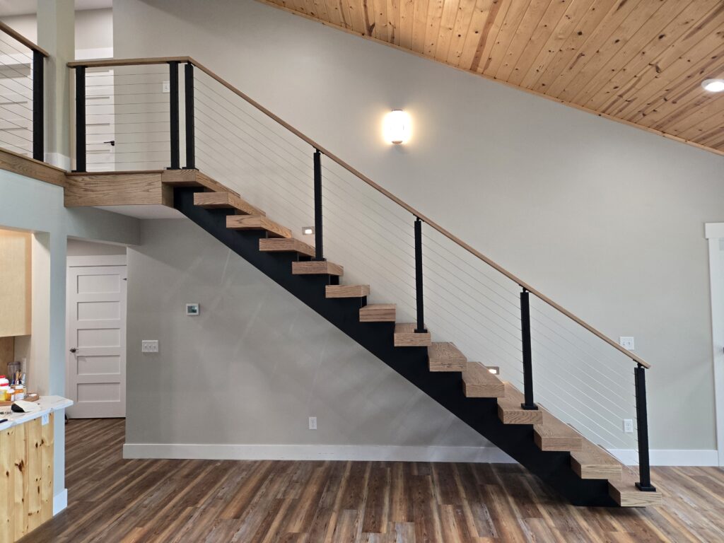 Rise is an entirely wooden system that utilizes a dual stinger design. The stringers are made of laminated red oak, and can be painted either white or black. The treads can be stained any color just like any of our other Viewrail stair systems, and this system pairs well with both rod and cable railing systems. The treads are fastened utilizing adhesives and dowel pins, so there are no exposed fasteners. The all wood construction and simple connections lend itself to a warm and inviting look that is still minimal and modern.